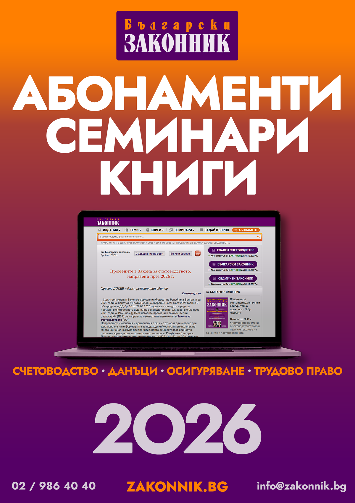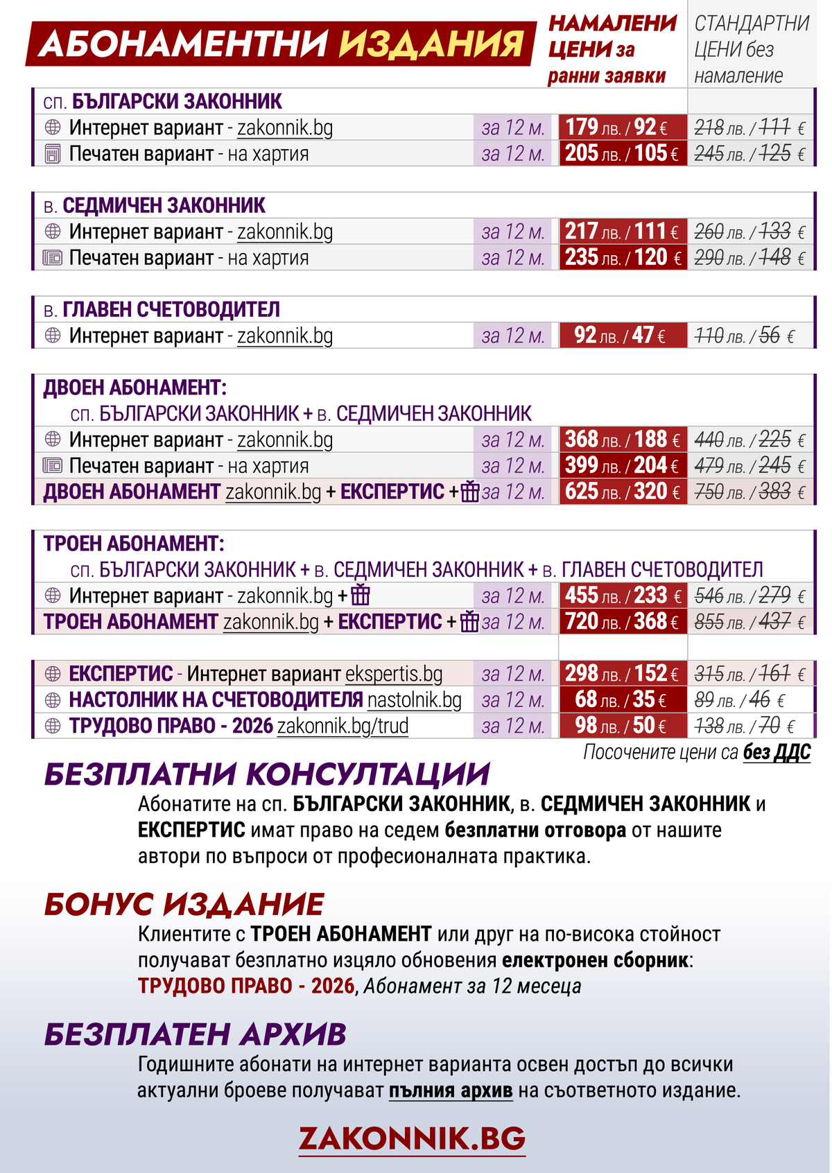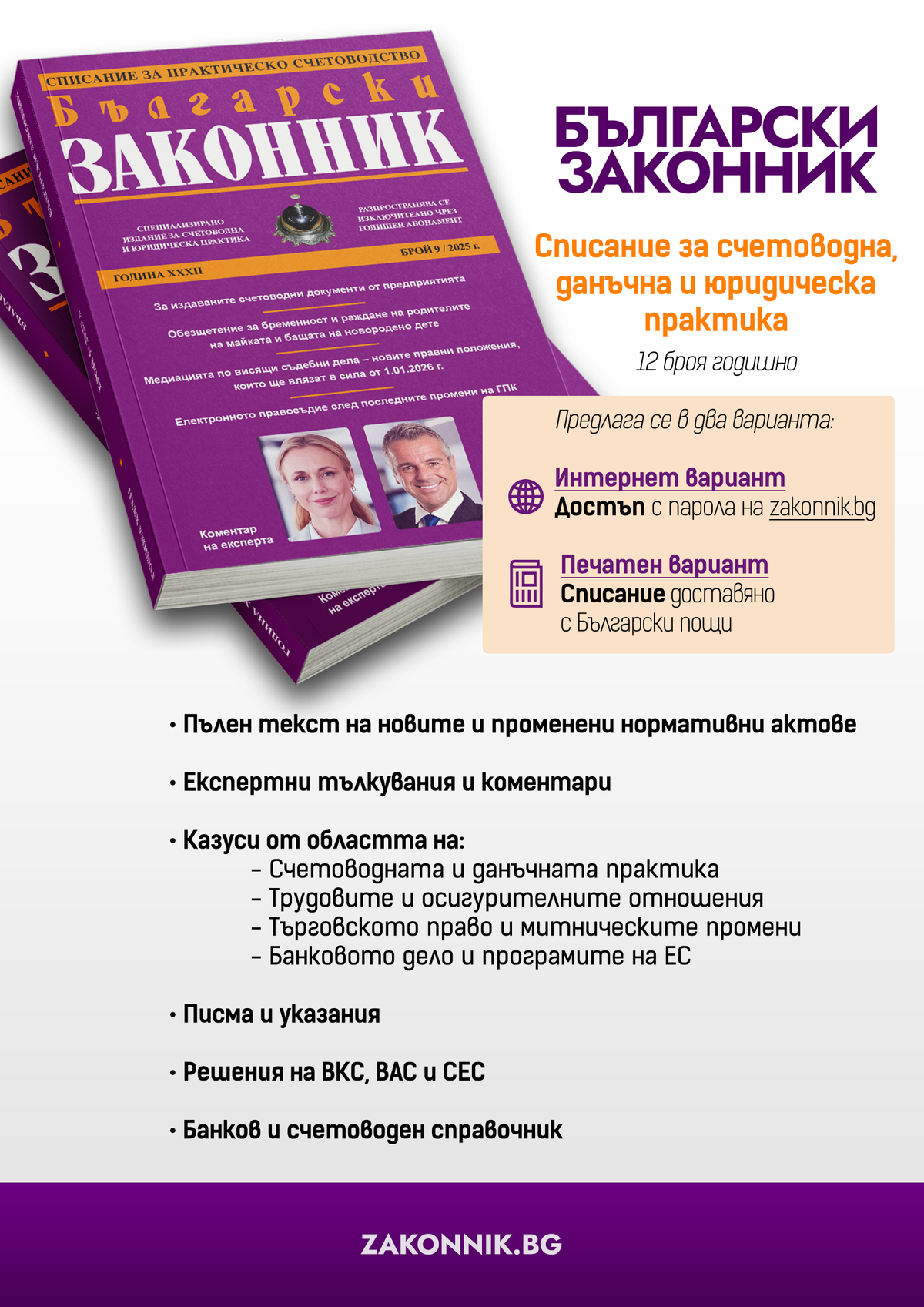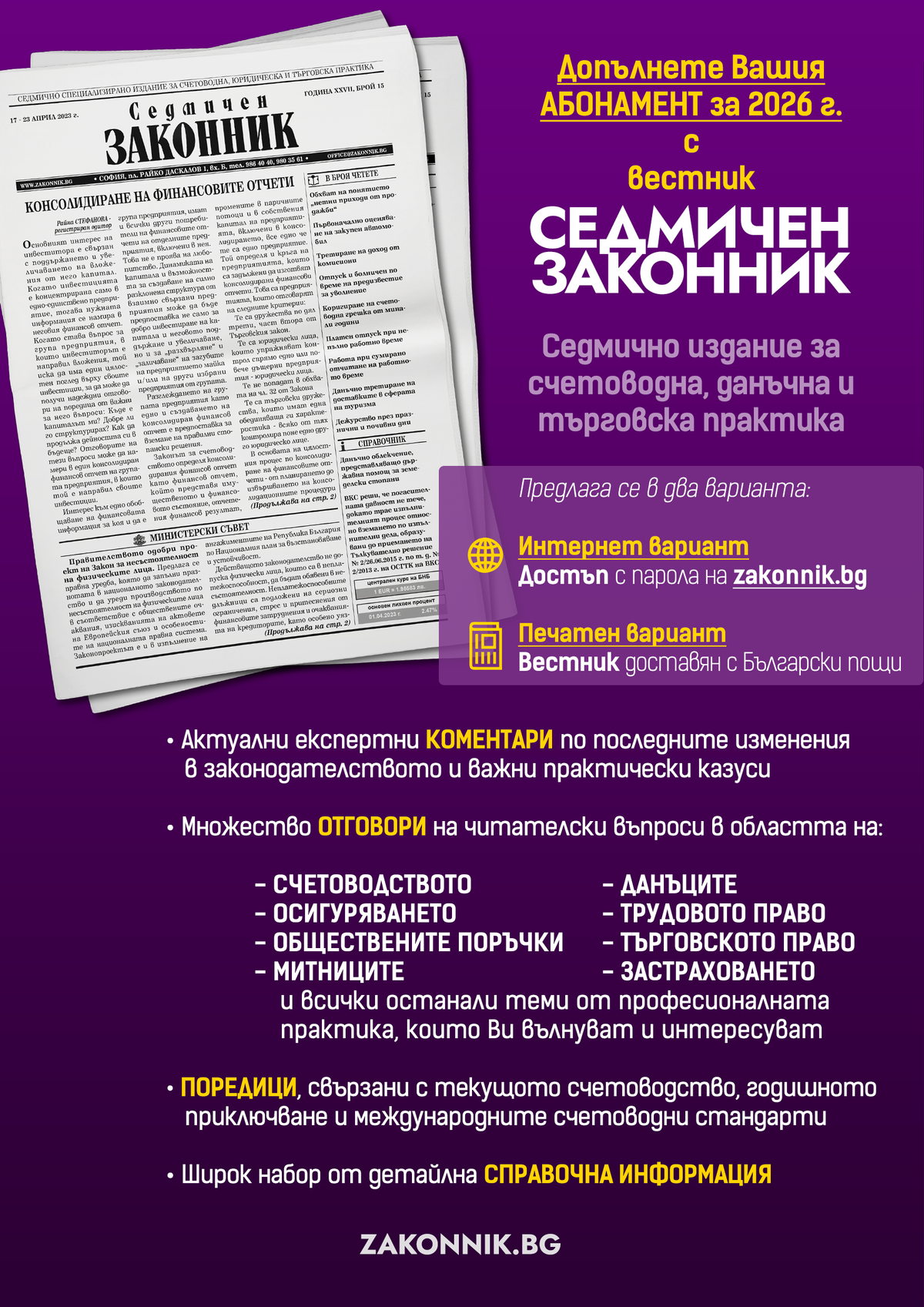 Списание Български законник (12 бр. годишно) Вестник Седмичен законник (седмично издание) Вестник Главен счетоводител (двуседмично издание) Счетоводна система Експертис (два пъти в седмицата нов брой) Справочна платформа Настолник на счетоводителя (регулярни актуализции) Сборника Трудово право (включени месечни актуализации за цялата 2026 г.)