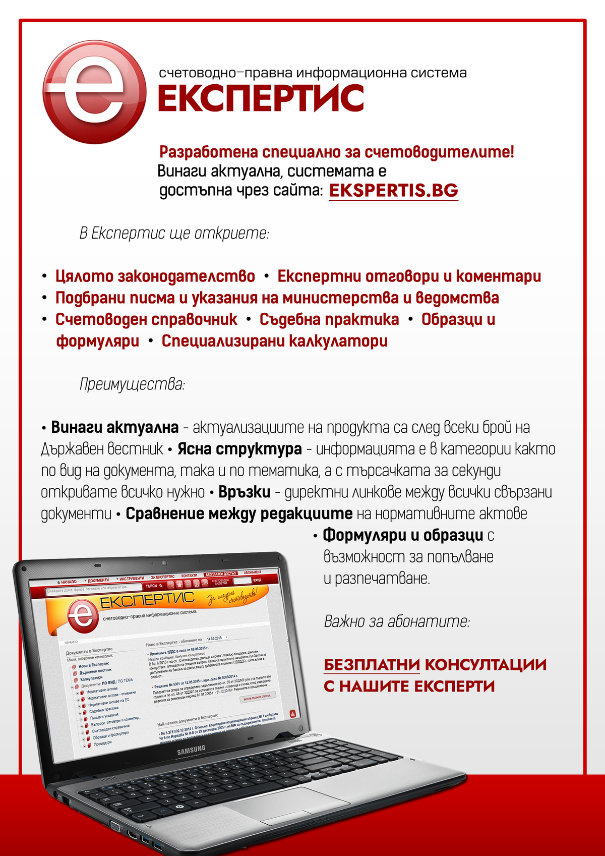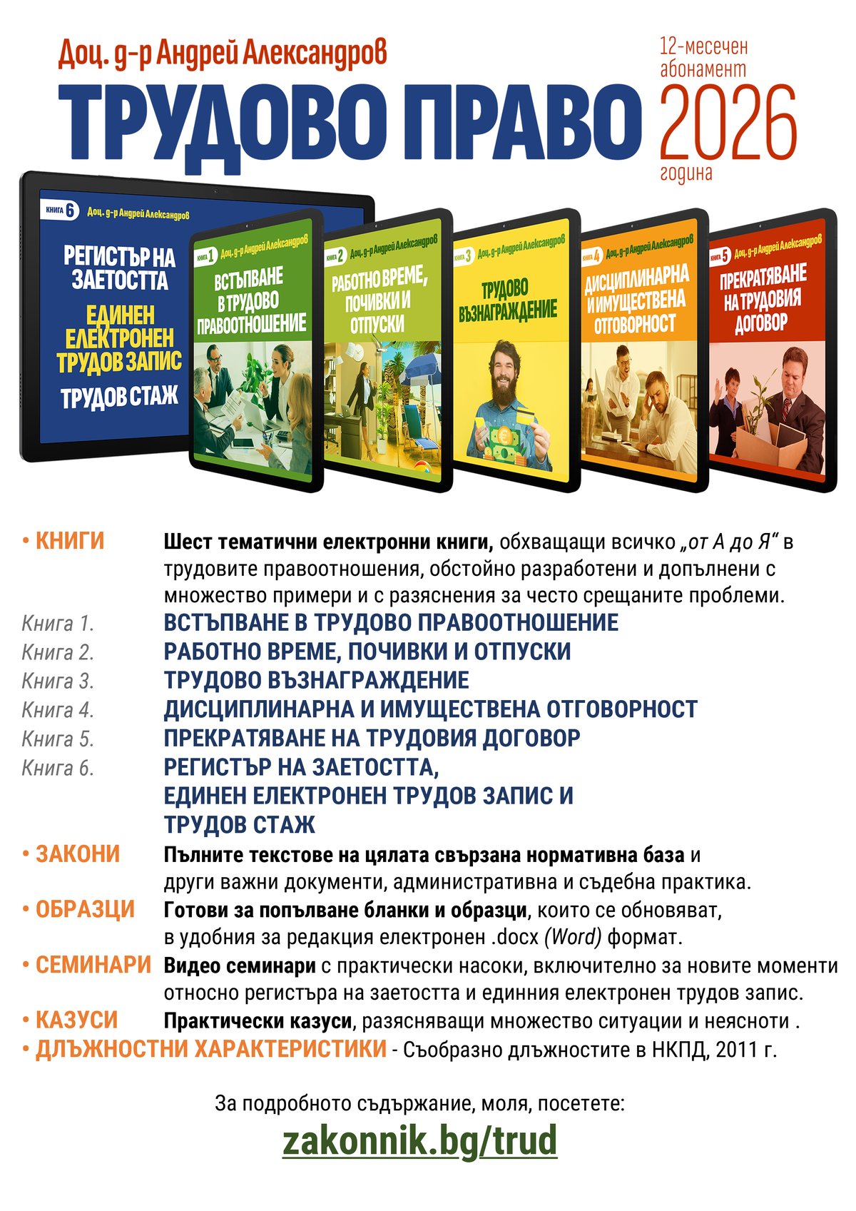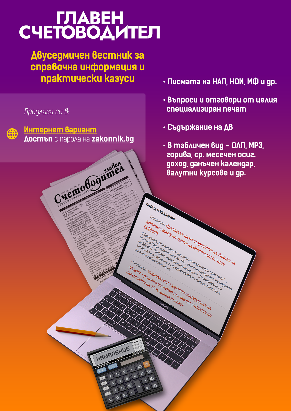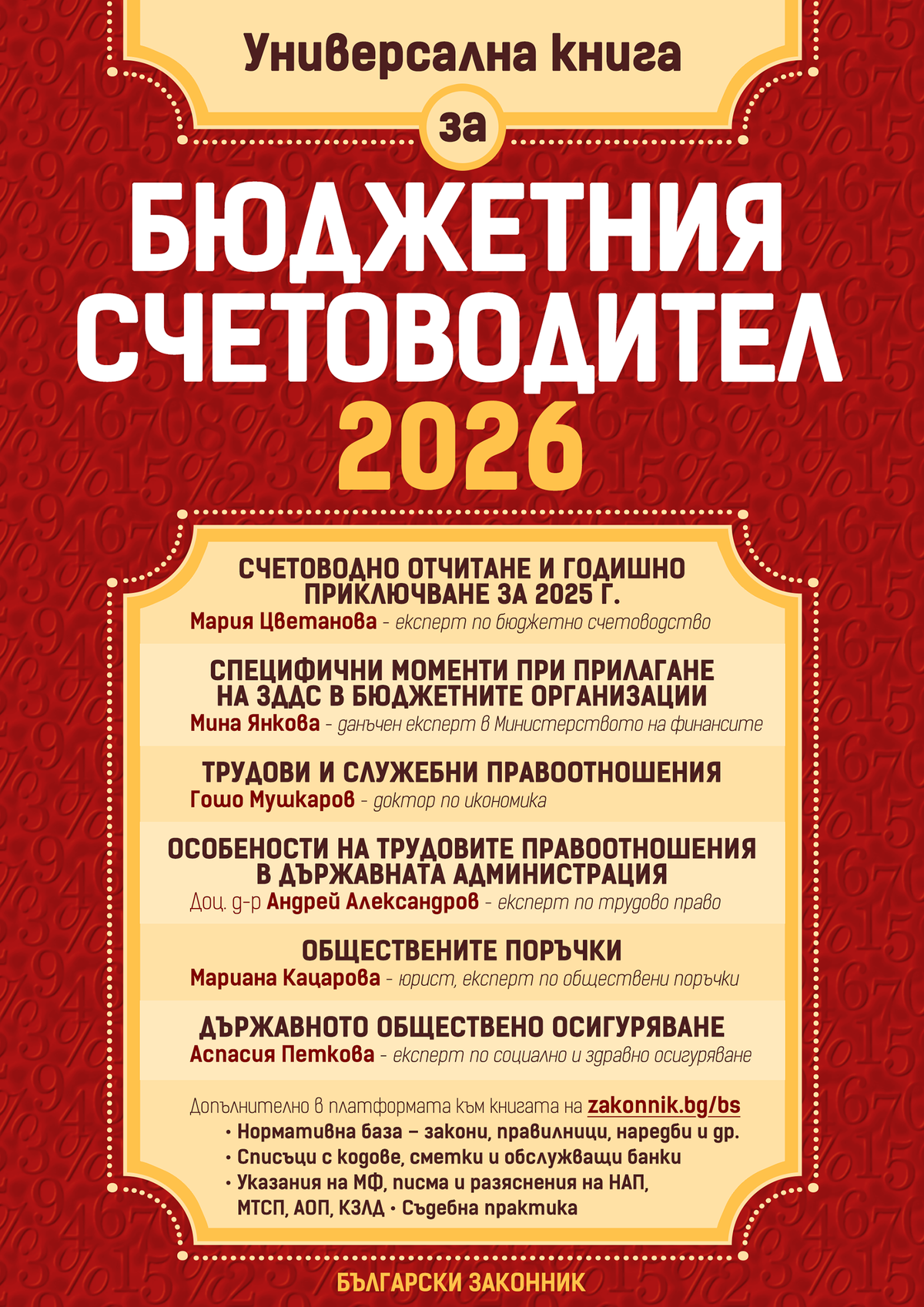 Списание Български законник (12 бр. годишно) Вестник Седмичен законник (седмично издание) Вестник Главен счетоводител (двуседмично издание) Счетоводна система Експертис (два пъти в седмицата нов брой) Справочна платформа Настолник на счетоводителя (регулярни актуализции) Сборника Трудово право (включени месечни актуализации за цялата 2026 г.)
