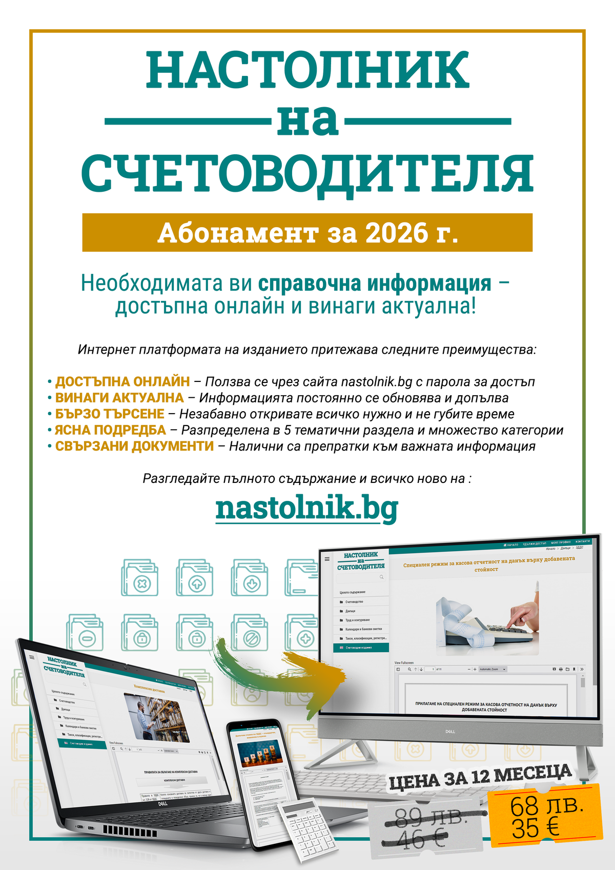 Независимо дали предпочитате печатни или електронни АБОНАМЕНТИ, присъствени или онлайн СЕМИНАРИ, или избирате нашите КНИГИ на хартия със съпровождащите ги интернет платформи, продуктите на издателството Ви гарантират сигурна и надеждна информация през цялата 2026 г.